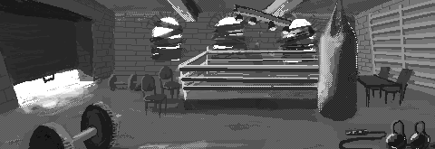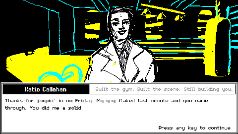 Katie a.k.a. Big Boss also get herself a new sprite, the last one was done in a bit of a rush and I didn't even notice her proportions were way different than the rest of the character sprites. Cally's gym also got a whole new look during the day that is more teletext-y. It definitely requires more polishing, but there are so many sprites to draw that it will just have to wait.